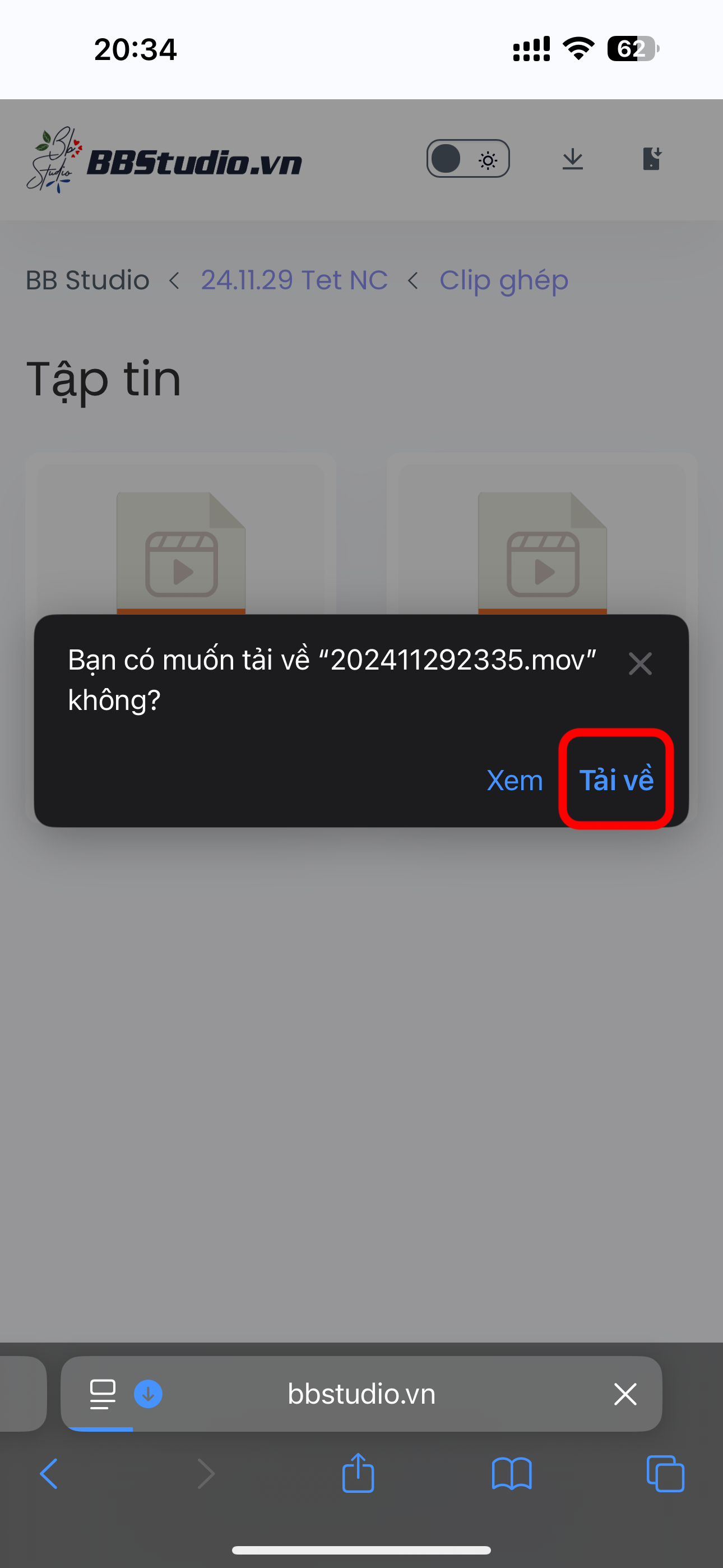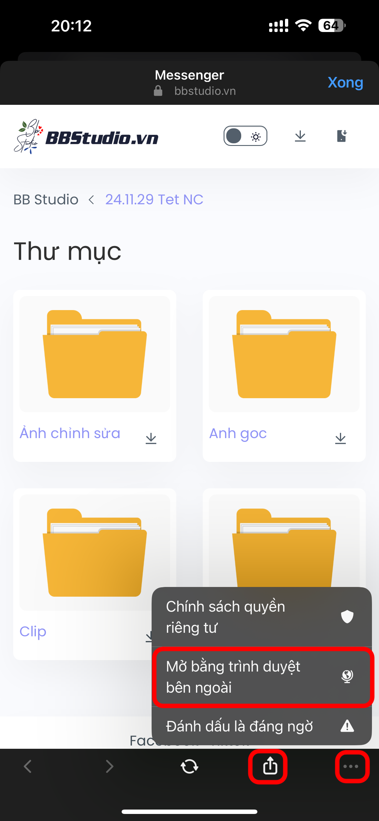 2. Bấm vào nút chia sẻ, hoặc nút 3 chấm. Sau đó bấm vào mở bằng Safari, hoặc mở bằng trình duyệt ngoài