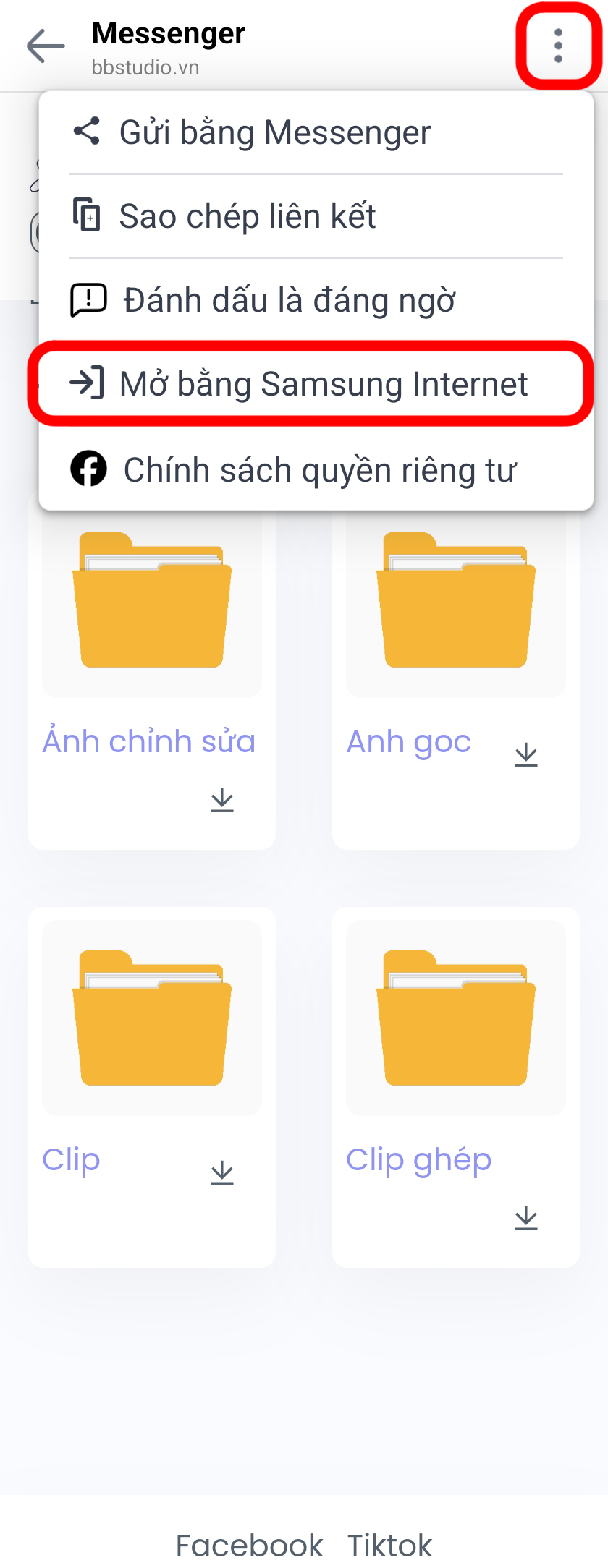 2. Bấm vào nút 3 chấm ở góc trên bên phải màn hình, sau đó bấm vào Mở bằng .... (Tùy thuộc dòng máy bạn sử dụng)