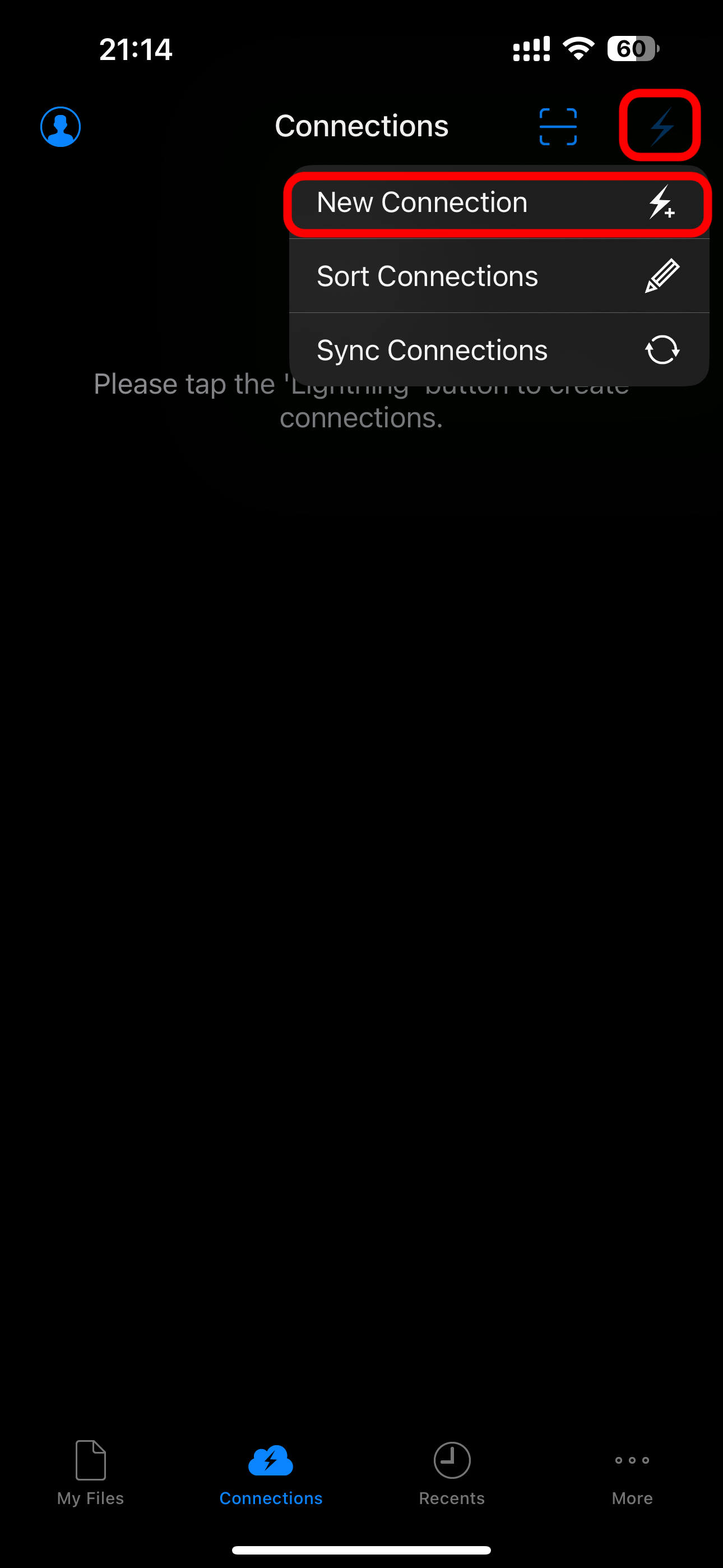 6. Bấm vào biểu tượng sấm sét ở góc phía trên bên phải màn hình, chọn New Connection