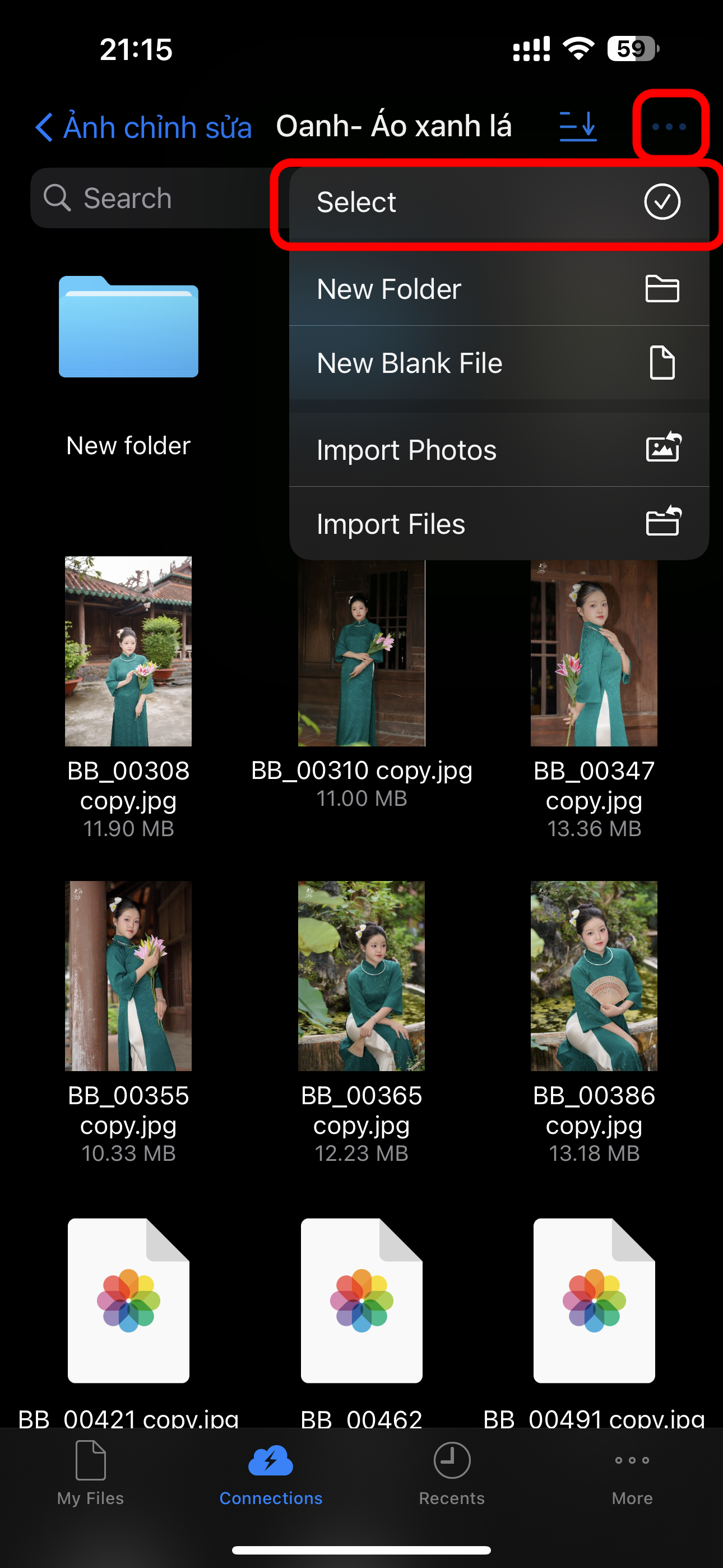 11. Di chuyển đến thư mục chứa ảnh, video cần tải. Sau đó bấm vào nút ... , và chọn Select để chọn nhiều hình, video 1 lúc